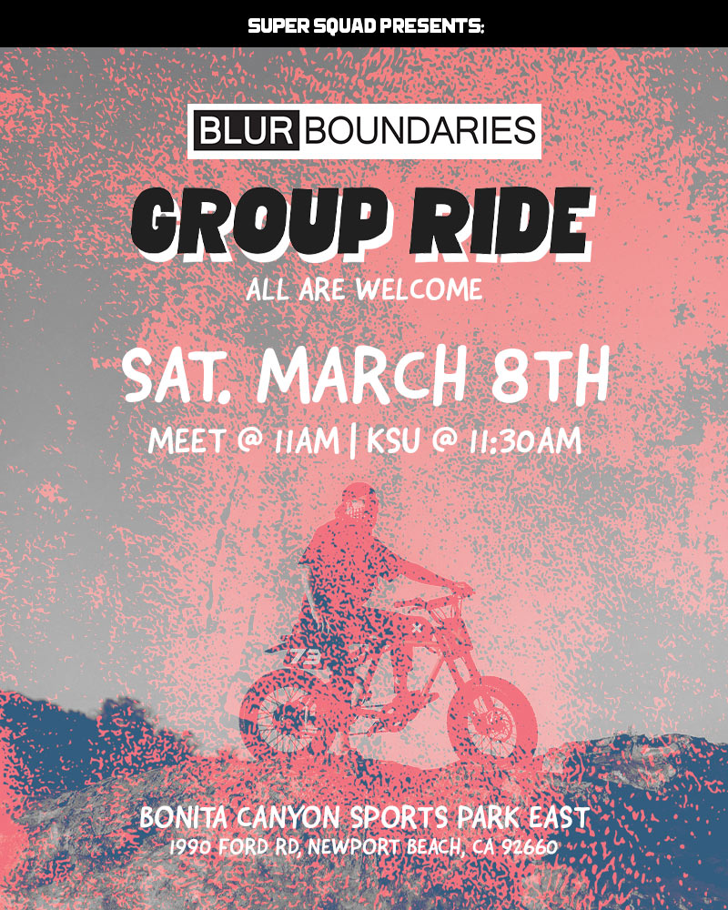 Join the Super Squad for the Blur Boundaries group ride on Saturday, March 8th in Newport Beach! Ride with us and meet Elijah, the founder of BLUR boundaries. We'll also have the latest products on display and a raffle for accessories. All riders are welcome!